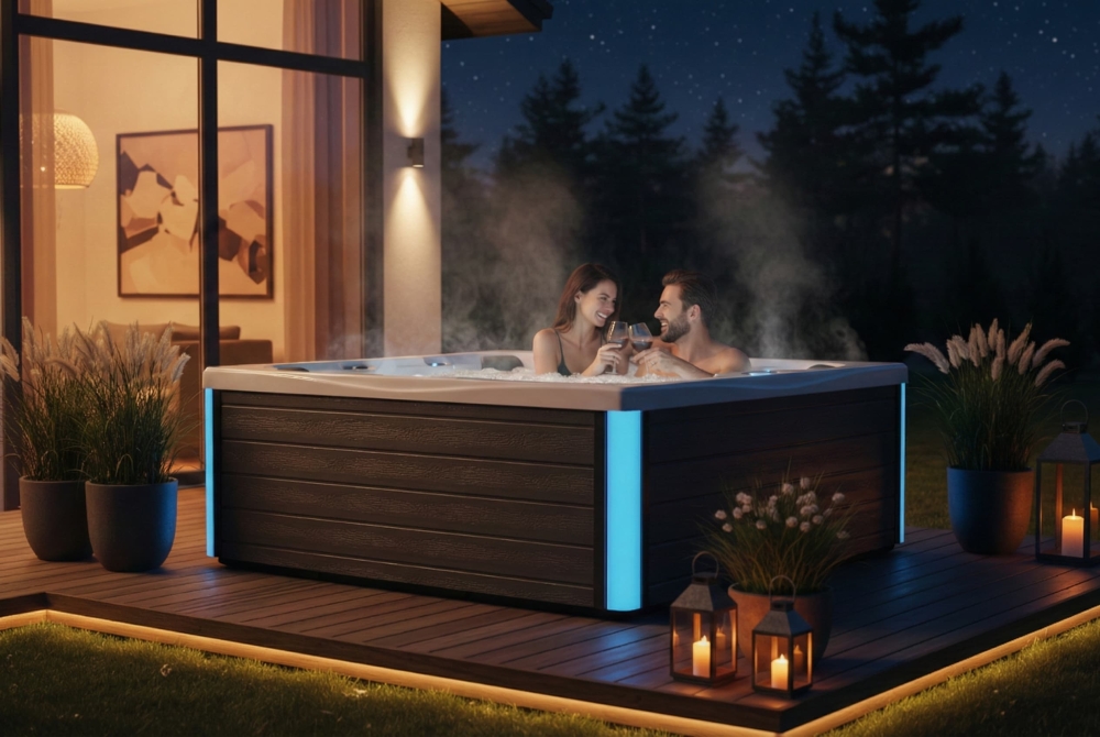 ELVA Cinema to odpowiedź na odwieczny dylemat: „leżeć czy siedzieć?”. Ten model oferuje to, co najlepsze z obu światów. Centralnym punktem jest luksusowa leżanka, która służy do pełnego hydromasażu ciała – od stóp po kark. To Twoja prywatna strefa wyciszenia. Pozostała część wanny to 5 ergonomicznych siedzisk, ułożonych w sposób sprzyjający rozmowom i integracji. To idealna konfiguracja dla rodzin lub grupy przyjaciół – nikt nie jest izolowany, a każdy cieszy się pełnym spektrum doznań, jakie oferują strategicznie rozmieszczone dysze wodno-powietrzne. Całość dopełnia nastrojowe oświetlenie linii wody, które wieczorami zmienia Twoje SPA w magiczną, tętniącą kolorami oazę.